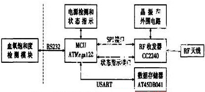 MCU部分是WPAN通信模塊的核心,完成通信模塊各組成部分的控制、協(xié)調(diào)和數(shù)據(jù)的加工。具體功能:通過RS232接口與血氧飽和度檢測(cè)模塊通信,實(shí)現(xiàn)對(duì)它的控制和配置,并接收檢測(cè)數(shù)據(jù);通過SPI接口和狀態(tài)指示接口實(shí)現(xiàn)對(duì)RF收發(fā)器的配置和檢測(cè),并完成發(fā)射和接收的數(shù)據(jù)交換;通過USART接口與數(shù)據(jù)存儲(chǔ)器連接,完成數(shù)據(jù)存儲(chǔ)器的讀寫操作;通過電源檢測(cè)和狀態(tài)指示部分,監(jiān)測(cè)電源電壓情況,并能通過狀態(tài)指示產(chǎn)生報(bào)警提示?! ?br />