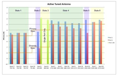 為了緩解各種使用模型的影響,有必要將狀態(tài)調(diào)諧和模式隔離兩種方法結(jié)合運用。模式隔離允許具有多個饋點的單天線結(jié)構(gòu)執(zhí)行多個MIMO天線的功能;而狀態(tài)調(diào)諧則允許這種結(jié)構(gòu)非常小,但仍然能夠非常高效地在寬頻率范圍內(nèi)工作。圖5顯示了以6個調(diào)諧狀態(tài)覆蓋多個頻段的可變狀態(tài)iMAT天線結(jié)構(gòu)的平均測量效率。iMAT結(jié)構(gòu)能在平衡或不平衡的增益配置下工作,并且與傳統(tǒng)天線設計技術相比,能以更小的封裝提供更高的性能。