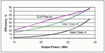 圖4可看出源電流下降的確切數(shù)量,圖中顯示了在不同輸出功率下測得的異相功率放大器的效率,它還顯示了理想B類和理想A類放大器的最大理論效率,實際的AB類放大器將在理想A類和理想B類曲線之間。注意,實際異相功率放大器測得的效率要優(yōu)于理論上完美的B類放大器。在全功率下,放大器完全工作在同相狀態(tài),可觀察到80%的效率。隨著進入放大器的信號相位減小,輸出功率也在下降,但是與典型的AB類放大器相比,效率下降要慢得多。在峰值以下7.8dB功率處(這是802.11a信號典型峰值-均值比率),放大器的效率為46%。