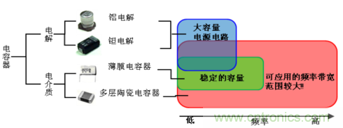 電容器有著各式各樣的種類。如圖1所示,電容器以生產(chǎn)材料可劃分為陶瓷電容器、鉭電解電容器、鋁電解電容器等。特別是多層陶瓷電容器,體積雖小但容量大,經(jīng)常被用于去藕、電源電壓的平滑化、濾波等各種電路中。最近已成了提升手機(jī)、電視機(jī)性能所不可缺少的元件。