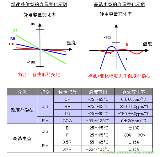 陶瓷電容器如圖2所示,可分為溫度補(bǔ)償型與高誘電型。由于各種溫度條件下的靜電容量變化情況各不相同,因此需要根據(jù)電容的特點(diǎn)來確定其用途。日本國內(nèi)所采用的JIS規(guī)格、歐洲所采用的EIA規(guī)格均做出了詳細(xì)的分類