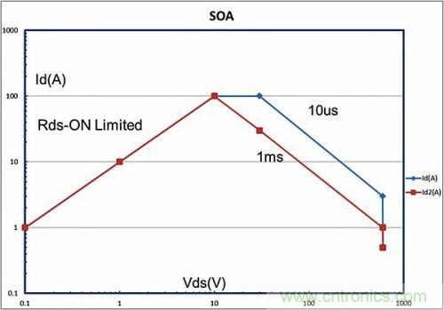 圖1.GaN FET SOA曲線示例,此時Rds-On = 毫歐