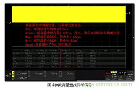 僅僅通過(guò)波形的直觀表現(xiàn)來(lái)分析異常信號(hào)遠(yuǎn)遠(yuǎn)不夠,只有將波形各項(xiàng)指標(biāo)精確量化,才能看透波形異常的本質(zhì)。ZDS2000系列示波器標(biāo)配的51種“真正意義”的參數(shù)測(cè)量,會(huì)把屏幕上捕獲的所有波形進(jìn)行統(tǒng)計(jì)分析,得出每一項(xiàng)的當(dāng)前值、最大值、最小值、平均值、標(biāo)準(zhǔn)差、統(tǒng)計(jì)次數(shù),用戶(hù)通過(guò)觀察最大值和最小值可快速了解波形中可能存在的異常,通過(guò)觀察平均值、標(biāo)準(zhǔn)差可快速評(píng)估信號(hào)特性。