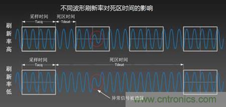 由此可知,死區(qū)時(shí)間的大小將影響捕獲周期的長(zhǎng)短進(jìn)而影響波形刷新率的高低。如下圖所示:
