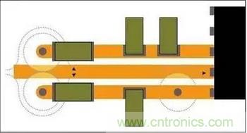 每個這些通孔都會在內(nèi)接地層上產(chǎn)生大于通孔直徑自身的禁入?yún)^(qū),提供制造空隙。這些禁入?yún)^(qū)很容易在回流路徑上造成中斷。一些通孔彼此靠近則會形成接地層溝,頂層CAD視圖看不見,這將導(dǎo)致情況進一步復(fù)雜化。圖2兩個電源層通孔的接地層空隙可產(chǎn)生重疊的禁入?yún)^(qū),并在返回路徑上造成中斷?;亓髦荒苻D(zhuǎn)道繞過接地層禁入?yún)^(qū),形成現(xiàn)在常見的發(fā)射感應(yīng)路徑問題。