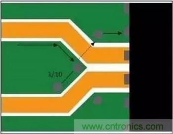 時鐘分布或合成器設(shè)備路由出來、用于承載相同頻率的跡線集群可能相鄰而行,因為干擾源音調(diào)已經(jīng)存在于接收器線路上。不過,分組的線路最終會分散。分散時,應(yīng)在分散線路之間提供接地灌流,并在其開始分散的地方灌入通孔,以便感應(yīng)回流沿著額定回流路徑流回。在圖3中,接地島末端的通孔可使感應(yīng)電流流到參考層上。接地灌流上其它通孔之間的間隔不要超過一個波長的十分之一,以確保接地不會成為共振結(jié)構(gòu)。