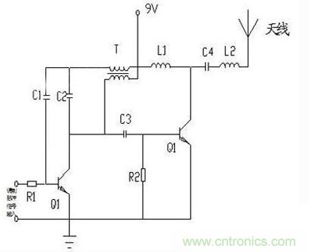 Q2是緩沖放大級(jí),Q1的輸出經(jīng)C3耦合到Q2(圖中右邊的“Q1”)基極,L1是Q2的負(fù)載電感;并經(jīng)C4/L2串聯(lián)諧振電路送到天線發(fā)射。R2接地,也就是零偏置,由于輸入信號(hào)幅度較大,且是以C4/L2諧振回路來選頻的,所以不怕失真,這樣效率較高。
