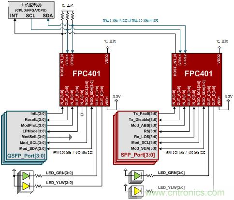 FPC401將多達(dá)56個端口的所有低速信號集成到單個快速I2C總線(高達(dá)1MHz)或串行外設(shè)接口(SPI)總線(高達(dá)10 MHz)中,大大降低了線路復(fù)雜性并簡化了設(shè)計(jì)可擴(kuò)展性。FPC401四個端口中的每一個端口都具有三個輸入、四個輸出和一個I2C主機(jī),從而實(shí)現(xiàn)對下游模塊的完全控制。有關(guān)SFP和QSFP連接的示例,請參見圖2。