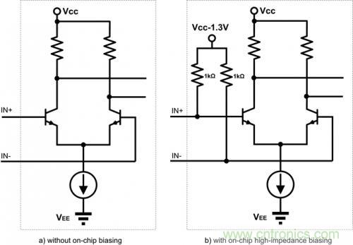 PECL 的輸入是一個(gè)具有高輸入阻抗的差分對(duì),該差分對(duì)的共模電壓需要偏置到VBB =VCC-1.3V,這樣允許的輸入信號(hào)電平動(dòng)態(tài)最大。對(duì)于不同芯片的輸入級(jí),信號(hào)允許的共模電平可能會(huì)有些差異,請參考相應(yīng)的datasheet。有部分芯片在內(nèi)部已經(jīng)集成了偏置電路,使用時(shí)直接連接即可,有的芯片沒有加,使用時(shí)需要在芯片外部加直流偏置。