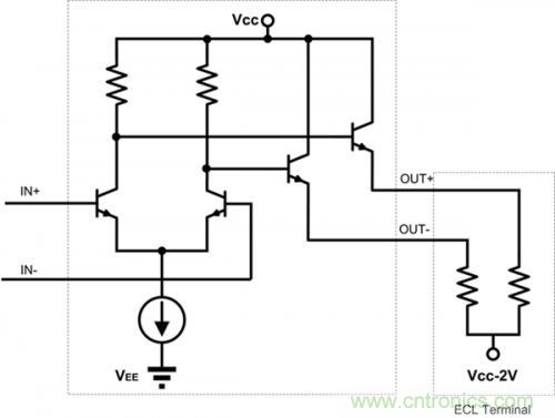 PECL的標(biāo)準(zhǔn)輸出負(fù)載是串聯(lián)50ohm至VCC-2V的電平上,在這種負(fù)載條件下,OUT+與OUT-的共模電壓是VBB=VCC-1.3V,OUT+/OUT-的輸出的平均電流為14mA。