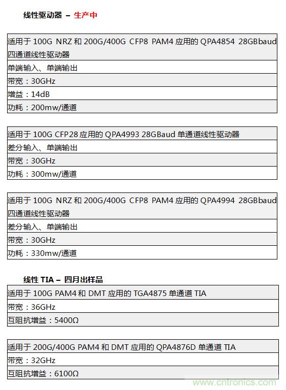 Qorvo全新的線性驅(qū)動器目前正在嵌入到光纖網(wǎng)絡(luò)系統(tǒng)中。單通道互阻抗放大器(TIA)預(yù)計四月可以出樣品。其他的四通道驅(qū)動器和新的互阻抗放大器(TIA)將于2017年底上市。
