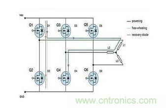 標(biāo)準(zhǔn)的三相功率級(jí)(power stage)被用來驅(qū)動(dòng)一個(gè)三相無刷直流電機(jī),如圖1所示。功率級(jí)產(chǎn)生一個(gè)電場(chǎng),為了使電機(jī)很好地工作,這個(gè)電場(chǎng)必須保持與轉(zhuǎn)子磁場(chǎng)之間的角度接近90°。六步序列控制產(chǎn)生6個(gè)定子磁場(chǎng)向量,這些向量必須在一個(gè)指定的轉(zhuǎn)子位置下改變?;魻栃?yīng)傳感器掃描轉(zhuǎn)子的位置。為了向轉(zhuǎn)子提供6個(gè)步進(jìn)電流,功率級(jí)利用6個(gè)可以按不同的特定序列切換的功率MOSFET。下面解釋一個(gè)常用的切換模式,可提供6個(gè)步進(jìn)電流。