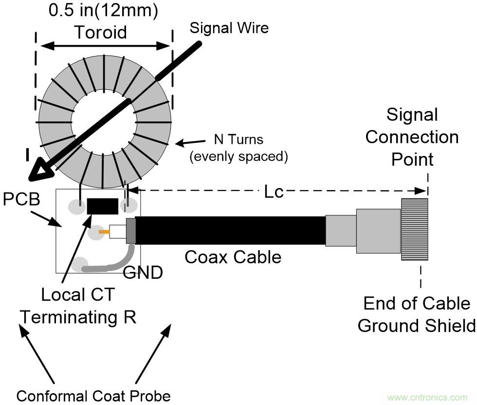 圖2所示的電流探頭使用SMD電阻,這就是為什么需要一個(gè)小PCB來安裝它并固定到同軸電纜的末端。務(wù)必保形涂覆整個(gè)電流互感器組件;繞組非常脆弱,同軸電纜會(huì)給電流探頭帶來很大的機(jī)械應(yīng)力。