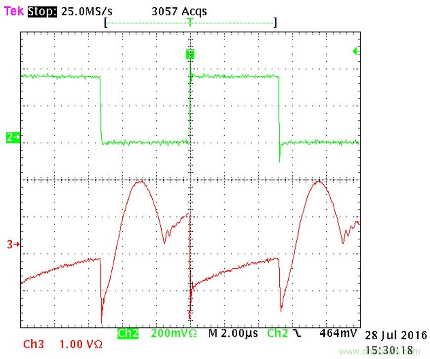 圖5:電流探頭會(huì)因?yàn)闀r(shí)間常數(shù)使輸入信號(hào)失真。上部(綠色)跡線為干凈的VDS,下部(紅色)跡線為失真的ID。