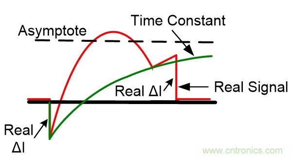 具有可與時(shí)間常數(shù)相比的周期的波形將因時(shí)間常數(shù)失真。時(shí)間常數(shù)被加到實(shí)際信號(hào)中。圖5為信號(hào)周期大于時(shí)間常數(shù)的1/2造成這種失真的一個(gè)例子。