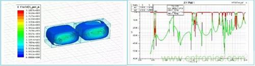 通過以上電場分布圖可以觀察到,單腔雙模,單腔三??梢宰杂蛇x擇。在高次模出現(xiàn)的頻率點上,通過選擇介電常數(shù),與控制諧振腔尺寸,對高次模進行優(yōu)化。盡量拉遠高次模出現(xiàn)的頻率,減小對通帶的影響。