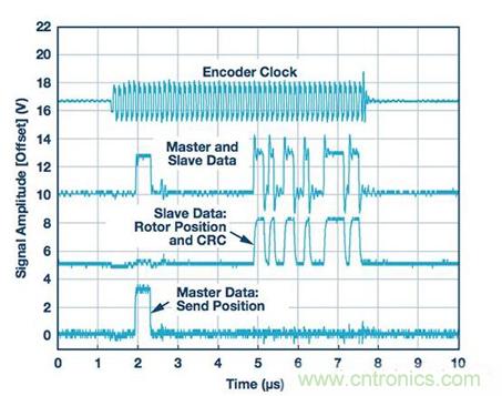 圖6顯示了EnDat系統(tǒng)的測試結果。測試使用的時鐘頻率為8 MHz,延遲補償通過接收時鐘相移實現(xiàn)。底部信號是來自EnDat主機的命令。此處顯示的命令為“發(fā)送位置”,其前面是兩個0,接著是六個1,最后又是兩個0。該命令總共有10位。編碼器的響應是從頂部起的第三個信號。合并數(shù)據(jù)線是從頂部起的第二個信號。最后,頂部信號是施加于編碼器的時鐘。