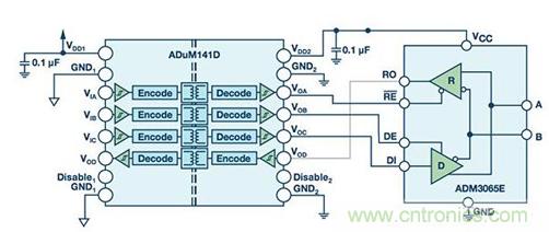 RS-485信號傳輸是平衡的差分式傳輸,本身便能抗干擾。系統(tǒng)噪聲均等地耦合到RS-485雙絞線電纜中的每條導線。一個信號的發(fā)射與另一個信號相反,耦合到RS-485總線的電磁場彼此抵消。這降低了系統(tǒng)的電磁干擾(EMI)。此外,ADM3065E增強的2.1 V驅動強度支持在通信中實現(xiàn)更高的信噪比(SNR)。給ADM3065E增加信號隔離可利用ADuM141D輕松實現(xiàn)。ADuM141D是一款采用ADI公司iCoupler®技術的四通道數(shù)字隔離器。ADuM141D的工作數(shù)據(jù)速率最高可達150 Mbps,因此它適合與50 Mbps ADM3065E RS-485收發(fā)器一起工作(參見圖2)。直接功率注入(DPI)法測量器件抑制注入到電源或輸入引腳的噪聲的能力。ADuM141D采用的隔離技術已通過測試,符合DPI IEC 62132-4標準。ADuM141D抗擾度性能超過同類產(chǎn)品。ADuM141D在整個頻率范圍內(nèi)保持了出色的性能,而其他隔離產(chǎn)品在200 MHz至700 MHz頻段出現(xiàn)位錯誤。