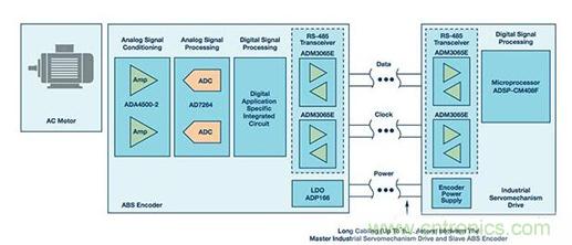 伺服驅動器和ABS編碼器之間的RS-485通信鏈路通常要求最高達16 MHz的高數(shù)據(jù)速率和低傳播延遲時序規(guī)格。RS-485線纜延伸長度最大值通常是50米,但有時候也可能長達150米。對數(shù)據(jù)通信而言,電機控制編碼器應用是具有挑戰(zhàn)性的環(huán)境,因為電氣噪聲和長電纜會影響RS-485信號傳輸?shù)耐暾?。本文重點闡述電機控制應用采用ADI公司50 Mbps (25 MHz) ADM3065E RS-485收發(fā)器和ADSP-CM40x混合信號控制處理器的主要好處。