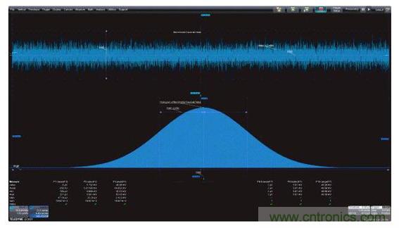 圖1:左上圖是帶寬受限的高斯噪聲的時域圖,左下圖是功率譜密度,是帶寬受限噪聲的頻域圖;右面的柱狀圖是帶寬受限噪聲的統(tǒng)計圖。這三個視圖都因采用了有助于對測量進行量化的測量參數(shù)而得到增強。