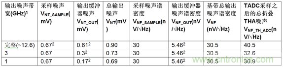 在采樣過(guò)程中,下游ADC將輸入帶寬(表1和表2中所示的濾波和ADC輸入帶寬的組合)上的所有THA噪聲外差到一個(gè)ADC奈奎斯特區(qū)間。因此,總折疊噪聲是ADC噪聲帶寬上的總THA輸出放大器時(shí)域噪聲的一部分。