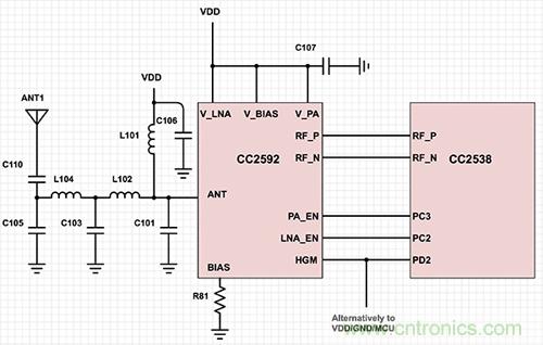 圖 2: 將 CC2592 增程器與 CC2538 射頻 SoC 配合使用非常簡單。在這種布局中,天線和匹配電路直接連接到增程器而非射頻 SoC。(使用 Digi-Key Scheme-it? 繪制的原理圖。圖片來源:Texas instruments)
