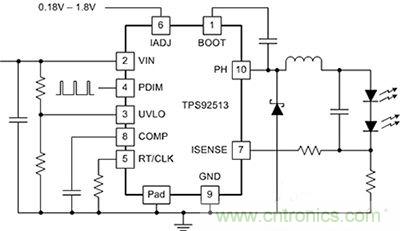 圖 2: TPS92513/HV LED 驅(qū)動(dòng)器典型應(yīng)用的簡化原理圖。