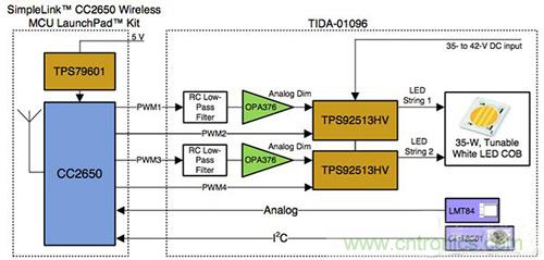 SimpleLink CC2650 無線 MCU 與 LED 驅(qū)動(dòng)器緊密協(xié)作,提供了兩個(gè)關(guān)鍵功能:驅(qū)動(dòng)器的控制信號,以及以無線方式影響這些信號的功能。這樣,便可以從智能手機(jī)上運(yùn)行的應(yīng)用程序中調(diào)節(jié)光輸出或色溫,或者允許 BMS 將燈關(guān)閉、打開、調(diào)亮或調(diào)暗 — 可能使用語音指令。