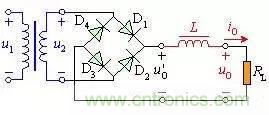 在橋式整流電路中,當(dāng)u2正半周時(shí),D1、D3導(dǎo)電,電感中的電流將滯后u2不到90°。當(dāng)u2超過(guò)90°后開(kāi)始下降,電感上的反電勢(shì)有助于D1、D3繼續(xù)導(dǎo)電。當(dāng)u2處于負(fù)半周時(shí),D2、D4導(dǎo)電,變壓器副邊電壓全部加到D1、D3兩端,致使D1、D3反偏而截止,此時(shí),電感中的電流將經(jīng)由D2、D4提供。由于橋式電路的對(duì)稱(chēng)性和電感中電流的連續(xù)性,四個(gè)二極管D1、D3;D2、D4的導(dǎo)電角θ都是180°,這一點(diǎn)與電容濾波電路不同。