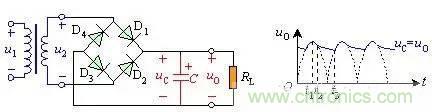 電容濾波一般負(fù)載電流較小,可以滿(mǎn)足td較大的條件,所以輸出電壓波形的放電段比較平緩,紋波較小,輸出脈動(dòng)系數(shù)S小,輸出平均電壓UO(AV)大,具有較好的濾波特性。