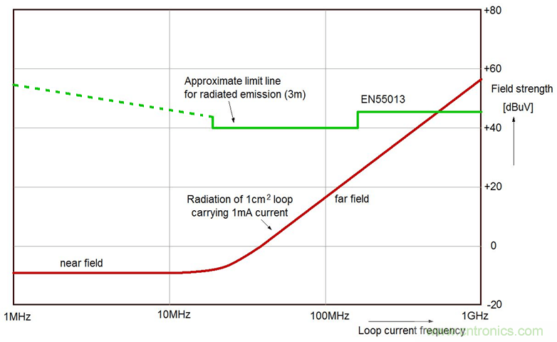 舉例而言,一個(gè)1cm²的電流環(huán),其中的電流為1mA,電流變化頻率為100MHz,則距離此電流環(huán)3m處的場強(qiáng)為4.4µV/m,或說是12.9dBµV。