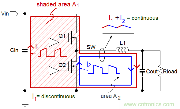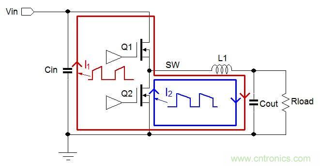 當(dāng)上橋MOSFET Q1導(dǎo)通的時(shí)候,電流從電源流出,經(jīng)Q1和L1后進(jìn)入輸出電容和負(fù)載,再經(jīng)地線回流至電源輸入端。在此過程中,電流中的交變成分會(huì)流過輸入電容和輸出電容。這里所說的電流路徑如圖2中的紅線所示,它被標(biāo)注為I1。
