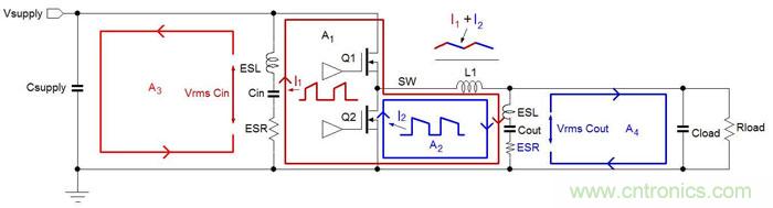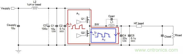 從電磁輻射的角度來看,圖3中存在陰影的A1區(qū)域是存在高電流變化率dI/dt的回路部分,這個(gè)回路將生成最多的高頻成分,因而在Buck轉(zhuǎn)換器的EMI設(shè)計(jì)中是需要被重點(diǎn)考慮的最關(guān)鍵部分。圖中A2區(qū)域的電流變化率dI/dt就沒有A1區(qū)域的高,因而生成的高頻噪聲也就比較少。