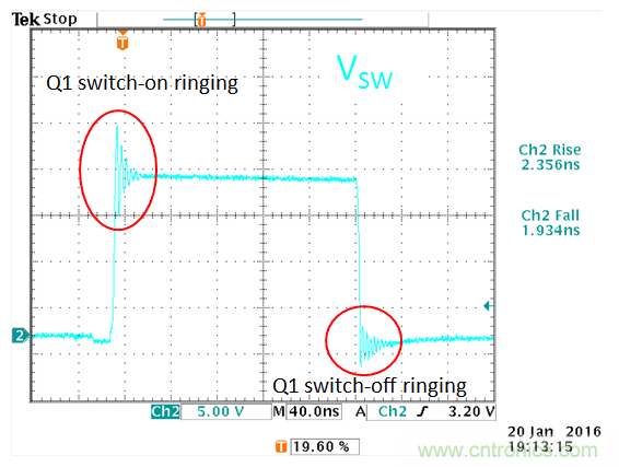 從實(shí)驗(yàn)結(jié)果來看,開關(guān)切換波形上的過沖實(shí)際上已經(jīng)消失了,但還存在低頻的振鈴信號。