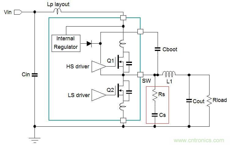 RC緩沖電路應(yīng)當(dāng)放置在緊靠開關(guān)節(jié)點(diǎn)和功率地處。在使用外部MOSFET開關(guān)的Buck轉(zhuǎn)換器中,RC緩沖電路應(yīng)當(dāng)直接跨過下橋MOSFET的漏極和源極放置。圖10示范了RC緩沖電路的放置位置。