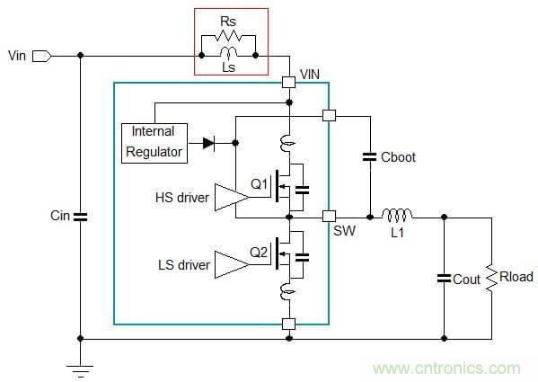 在理想狀況下,輸入、輸出電容對于Buck轉(zhuǎn)換器的開關(guān)電流來說都具有極低的阻抗。但在實(shí)際上,電容都存在ESR和ESL,它們都增加了電容的阻抗,并且導(dǎo)致上面出現(xiàn)額外的高頻電壓跌落。這種電壓跌落將在電源供應(yīng)線路上和負(fù)載連接電路上形成相應(yīng)的電流變化,見圖4。