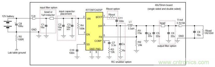 本章將示范在Buck轉(zhuǎn)換器的EMI設(shè)計(jì)中的不同方法所導(dǎo)致的影響。示范所使用的IC是RT7297CHZSP,一款800kHz工作頻率、3A輸出能力的電流模式Buck轉(zhuǎn)換器,采用PSOP-8封裝。測試中的電路工作在12V輸入下,輸出為3.3V/3A,測試所用電路顯示在圖12中。