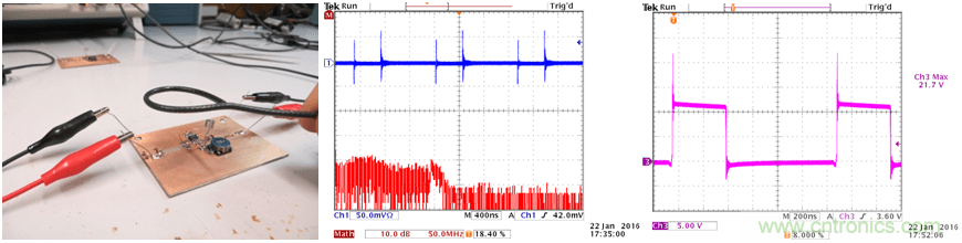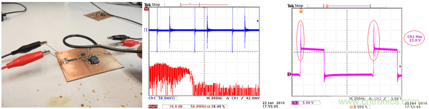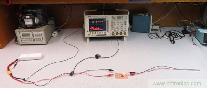 輸入線靠電池一側(cè)的接地端通過一只100Ω的電阻和實(shí)驗(yàn)臺的地連接在一起,這就給整個(gè)電路提供了一個(gè)參考地,其阻抗很像EMC測試中的LISN網(wǎng)絡(luò)。