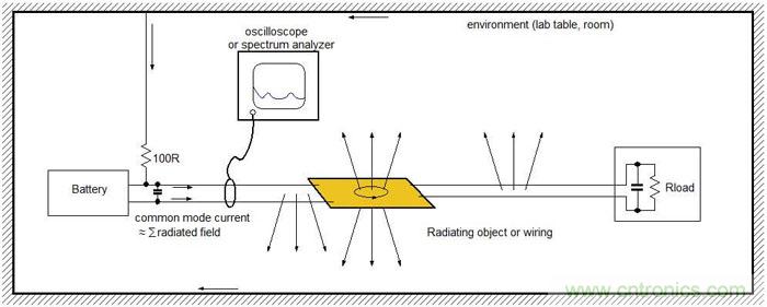 當(dāng)被測試對象被放在實(shí)驗(yàn)桌上時(shí),其PCB上的電流回路和導(dǎo)線就會(huì)向周圍環(huán)境輻射出高頻能量,這些輻射信號又會(huì)自己找到路徑返回到測試對象上,并以高頻共模電流的形式出現(xiàn)在供電線上。這些供電線上的高頻共模電流會(huì)和板上的電流結(jié)合在一起,可被用著輻射狀況的指示信號。