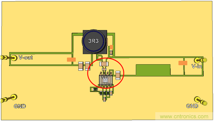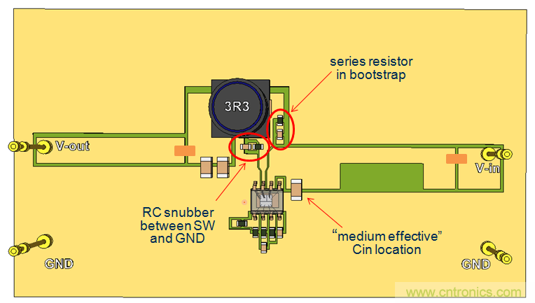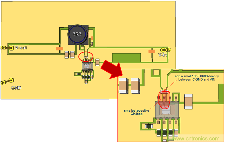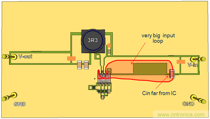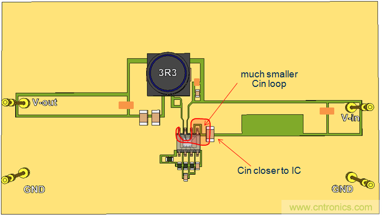 我們繼續(xù)使用單面PCB,并將CIN放置到靠近IC的地方,這樣就形成了比較小的CIN回路。參見圖20。