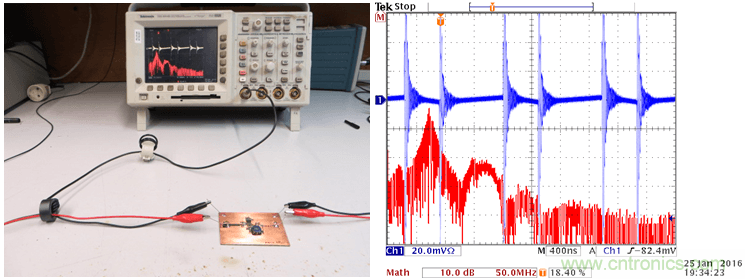 這種環(huán)形天線可以被連接到頻譜分析儀上,當(dāng)你使它在PCB上方移動(dòng)時(shí),你就可以看到哪里會(huì)有比較強(qiáng)的高頻磁場。你也可以把它連接到一臺示波器上(使用50Ω的端子),示波器上就可以顯示出相應(yīng)區(qū)域的切換噪聲水平。保持天線環(huán)和板子之間的相對位置和距離不變,對電路、PCB上的回路做出某些改變,你就可以知道噪聲水平在增加或是減少。
