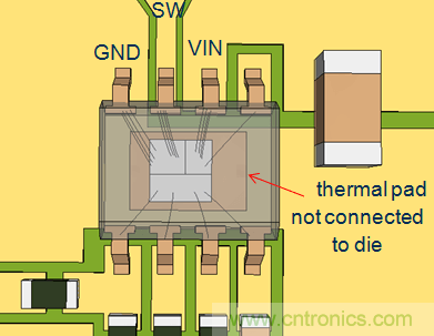 在RT7297CHZSP中,芯片底部的散熱焊盤是沒有和晶圓內(nèi)核連接在一起的,所以在PCB布局中將銅箔和散熱焊盤連接在一起并不能縮短CIN回路。它的上橋MOSFET和下橋MOSFET通過多根邦定線連接到VIN和GND端子,因而可以通過這兩個(gè)端子形成最短的回路。