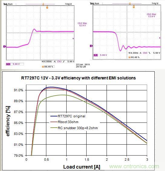 RC平滑抑制電路對效率的影響會(huì)比較大,特別是在輕載和中等負(fù)載的情況下,但最大也就1~2%,處于可以接受的范圍。需要特別注意的是,當(dāng)Buck轉(zhuǎn)換器的工作頻率很高和輸入電壓很高的時(shí)候,RC平滑抑制電路對效率的影響會(huì)很大。