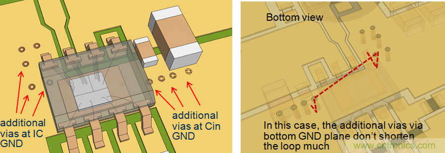 在上面的例子中,通到地線層的附加導(dǎo)通孔對縮減CIN回路的長度沒有幫助。但在另一個(gè)例子中,由于頂層的路徑很長,通過導(dǎo)通孔來縮小回路面積就十分有效。