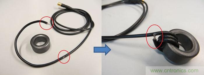 為了將測試工具和測試對象隔離開,最好是在電纜上加一個(gè)共模線圈,這可通過將引入分析裝置的電纜多次穿過一個(gè)扣合式的EMI鐵芯來實(shí)現(xiàn)。