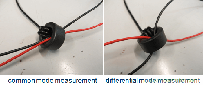 將電源線的正、負(fù)兩條線以同一個(gè)方向穿過鐵芯可測量其中的共模電流,顛倒其中一條線的方向則可測量差模電流。參見圖45。