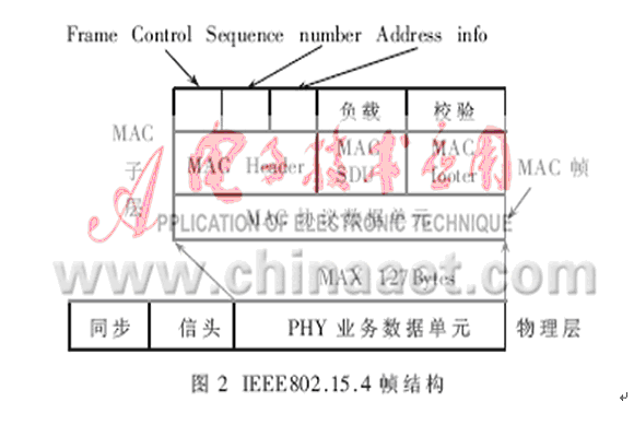 IEEE802.15.4的MAC協(xié)議包括以下功能:設(shè)備間無線鏈路的建立、維護和結(jié)束;確認模式的幀傳送與接收;信道接入控制;幀校驗;預(yù)留時隙管理;廣播信息管理。MAC子層提供兩個服務(wù)與高層聯(lián)系,即通過兩個服務(wù)訪問點(SAP)訪問高層。通過MAC通用部分子層SAP(MCPS-SAP)訪問MAC數(shù)據(jù)服務(wù),用MAC層管理實體SAP(MLME-SAP)訪問MAC管理服務(wù)。這兩個服務(wù)為網(wǎng)絡(luò)層和物理層提供了一個接口。靈活的MAC幀結(jié)構(gòu)適應(yīng)了不同的應(yīng)用及網(wǎng)絡(luò)拓撲的需要,同時也保證了協(xié)議的簡潔。MAC幀的通用格式如圖2所示。