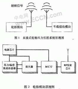 該系統(tǒng)的基本工作原理如下,把輪胎模塊裝置在輪胎內(nèi),壓力和溫度傳感器檢測(cè)輪胎內(nèi)部當(dāng)前的應(yīng)力和溫度信息,獲得的模擬信號(hào)經(jīng)過A/D變換器轉(zhuǎn)換成數(shù)字信號(hào),然后通過射頻發(fā)射器發(fā)送出去。車載接收模塊裝置在駕駛室內(nèi),射頻接收器接收來自輪胎模塊的應(yīng)力和溫度信息,當(dāng)輪胎壓力過高或者過低時(shí),通過顯示和報(bào)警裝置發(fā)出報(bào)警信息。