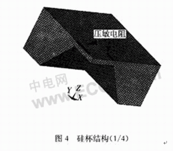 其中,壓阻式壓力傳感器主要是利用半導(dǎo)體的壓阻效應(yīng),把一個(gè)惠斯通電橋做在一個(gè)硅杯上,如圖4所示。當(dāng)硅杯受到壓力后發(fā)生形變,惠斯通電橋的四個(gè)橋臂電阻就會(huì)發(fā)生變化,打破了電橋的電平衡,從而會(huì)有一個(gè)電信號(hào)的輸出。