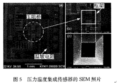 圖5是本文制作的傳感器芯片的電鏡照片。圖5(a)為器件正面全貌;圖5(b)為薄膜正面;圖5(c)為薄膜背面。其中壓敏元件采用比常規(guī)更厚的50μm硅杯薄膜(500 μm×500μm),增大了體硅上高應(yīng)力區(qū)的面積,在降低工藝要求的同時(shí)提高了線性測(cè)量范圍和過載壓力。壓敏電阻設(shè)計(jì)為折線結(jié)構(gòu),采用優(yōu)化的幾何尺寸,并將其部分制作在高應(yīng)力體硅上以獲得更高靈敏度。體硅上的溫敏電阻隨壓敏電阻利用同步注入工藝制作,減小了工藝復(fù)雜度。該器件工藝簡(jiǎn)單,成品率高,與標(biāo)準(zhǔn)IC工藝兼容。
